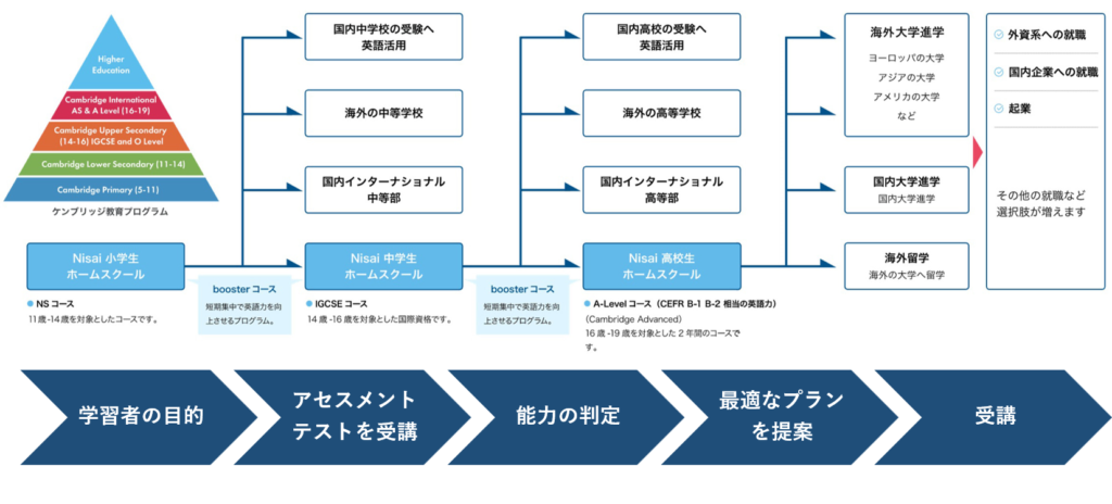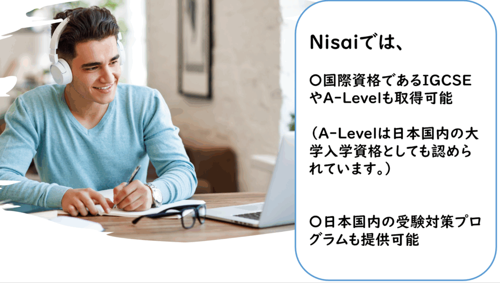 国内で不登校生徒やホームスクールを選択されているお子様も、よくNisaiへ来られます。周りの環境や友達関係などにより日本の学校やインターナショナルスクールへ行くことができなくなってしまった。そんな時は自宅でNisaiの受講をしてインターナショナル教育を継続して受けていただくことができます。しかも、国際資格であるIGCSEやALevelも取得できることから大学進学への道も開かれています。またAlevel資格は日本国内の大学の入学資格としても文科省は認めているため、日本の大学受験もできるようになっています。私たちは国内の予備校(JOI)とも提携していますので、国内受験対策プログラムも提供することができます。