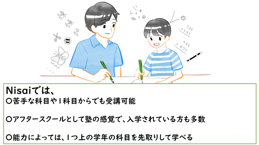 現地のインターナショナルスクールに通っているものの「数学が弱い」「もう少しEnglishを強化したい」という方も多いはずです。Nisaiはインターナショナルスクールでありながら、1科目から受講していただくことができます。国内のインターに在学中でいても、生徒様でアフタースクールとして塾の感覚で入学していただく方も多くおられます。