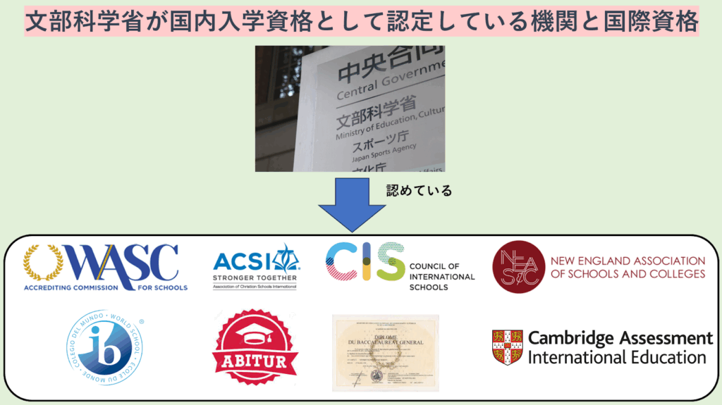 文部科学省によれば、日本の大学入試資格に該当すれば大学入学資格が認められます。指定されたインターもしくは国際認定を受けたインター出身者で、特定の条件を満たしていれば日本の大学入試を受けることができます。文部科学省は国際バカロレア資格、国際Aレベル資格などを取得した者、そして指定されたインターの課程を修了したものも受験を認めてみます。