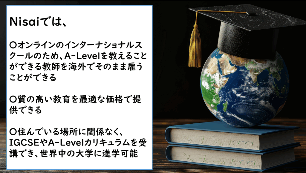 インターナショナルスクールでよく課題としてあがるのが「十分な質のIGCSEやAlevelカリキュラムを実施している学校がそれほど多くない」という点です。もちろん質の高いAlevelカリキュラムを提供している学校もあります。しかしながら、多くの場合はAlevelを教えることができる上級教師を海外から招いたり、他の学校から引き抜くこともあるため雇う費用が高くなります。そのため学費も高額になってしまうことがほとんどです。私たちNisaiは完全オンラインのインターナショナルスクールのため、Alevelを教えることができる教師を海外でそのまま雇うことができます。質の高い教育を最適な価格で提供しています。住んでいる場所に関係なくIGCSEやAlevelカリキュラムを受講でき世界中の大学へ進学することができます。