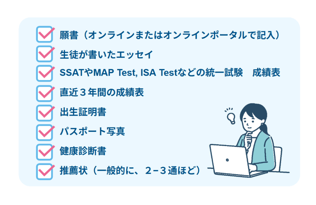 必要な書類は各学校のホームページの「Admissions」セクションから詳細が英語で書かれています。多くの場合は以下の書類が求められます。