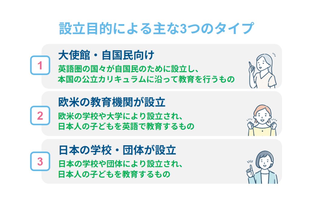 - 英語を第一言語とする国が日本に住む自国人のために設立した学校。各国の公立学校のカリキュラムに沿った内容を教えており、外交官や仕事で来日してる家庭のお子様を教育するのが目的です。