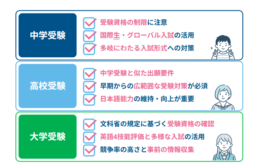 日本語・外国語による作文や日本語での試験なども試験内容に含まれる場合があります。インター在学中は日本語能力を高めることも重要です。各学校の入試に出される問題形式や傾向を理解し、面接や作文対策も行っていくと良いでしょう。特に、英語で教育を行っている場合は日本語の読解力、漢字の読み書きや敬語の使い方などが学校教育だけでは不十分の場合があります。