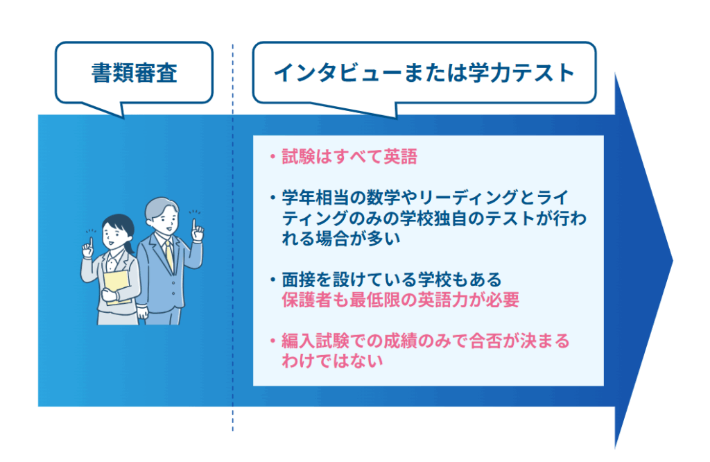日常会話での英語力だけではなく、編入を希望する学年相当のリーディングやライティングなどの課題を受験時もしくは必要書類の一部として事前に提出が必要とされます。ですので、早期からの対策が必要になってきます。