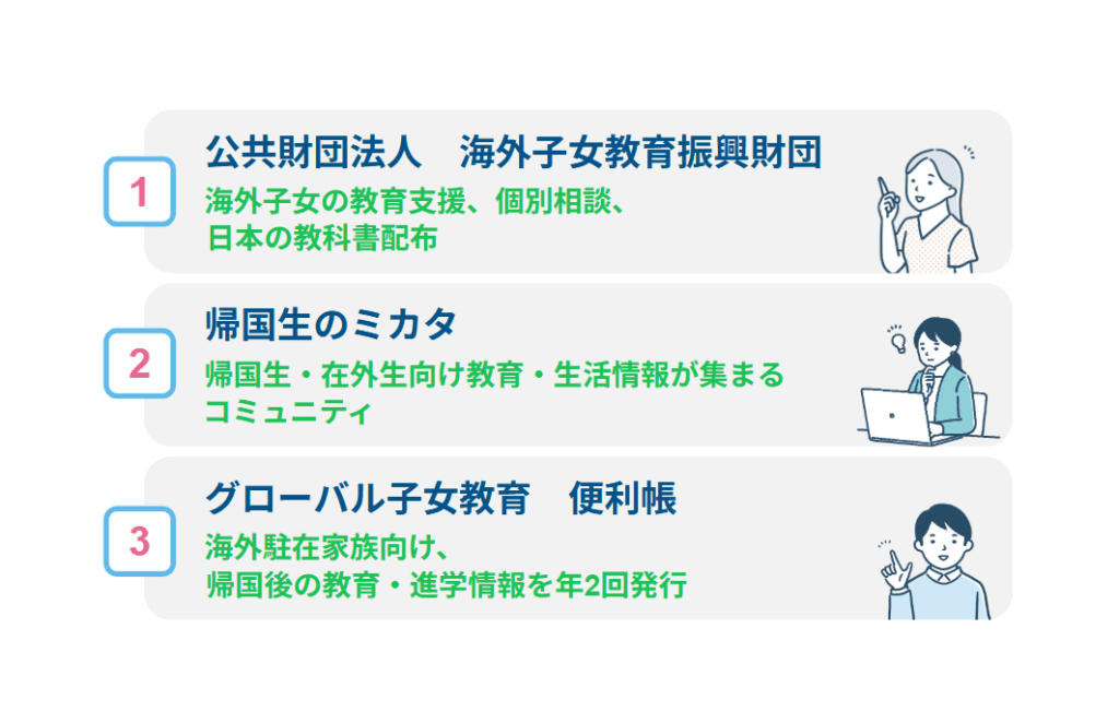 帰国後の学校選びや受験準備などで役に立つサイトを一部ご紹介します。どのサイトも帰国子女やインター出身者向けの編入・進学サポートを行なっています。