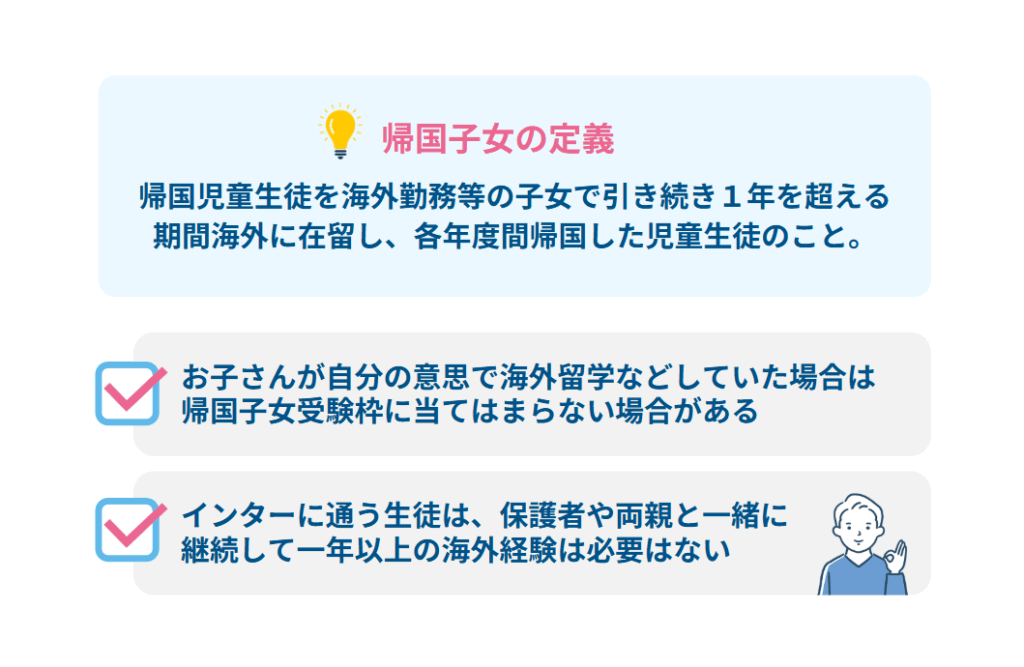 - 小学生から高校生の間に継続して一年以上海外に在留し、親の都合などで海外に滞在していた児童のことを指します。お子さんが自分の意思で海外留学などしていた場合は帰国子女として帰国後の学校の帰国子女受験枠に当てはまらない場合があります。